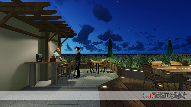 屋頂花園設計中,防腐木露臺結(jié)合美妙的景觀照明,增添了更多浪漫的氛圍。